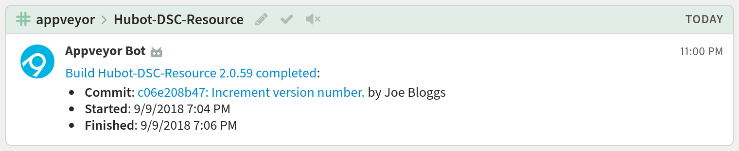Create a bot for AppVeyor. Make sure that you select Incoming webhook as the Bot type.