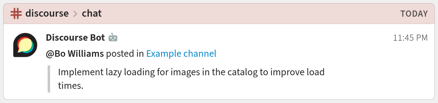 Create a bot for Discourse. Make sure that you select Incoming webhook as the Bot type.