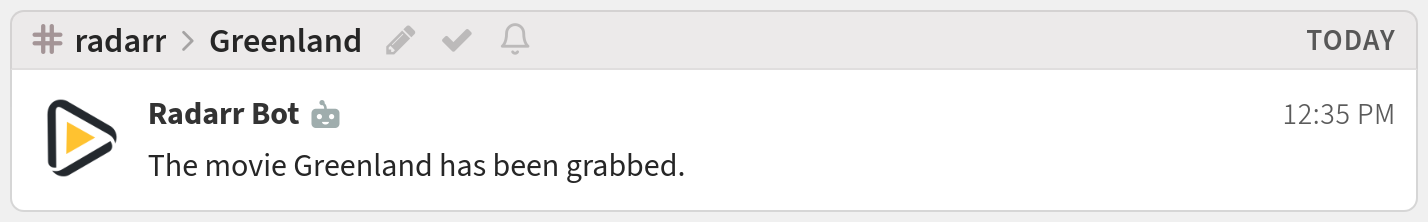 Create a bot for Radarr. Make sure that you select Incoming webhook as the Bot type.