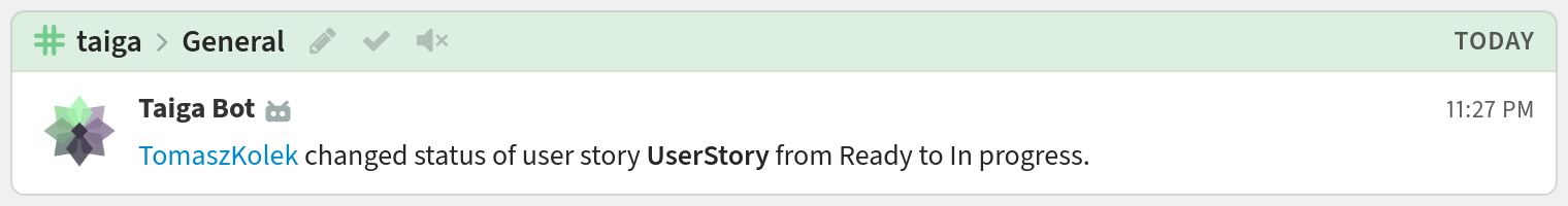 Create a bot for Taiga. Make sure that you select Incoming webhook as the Bot type.